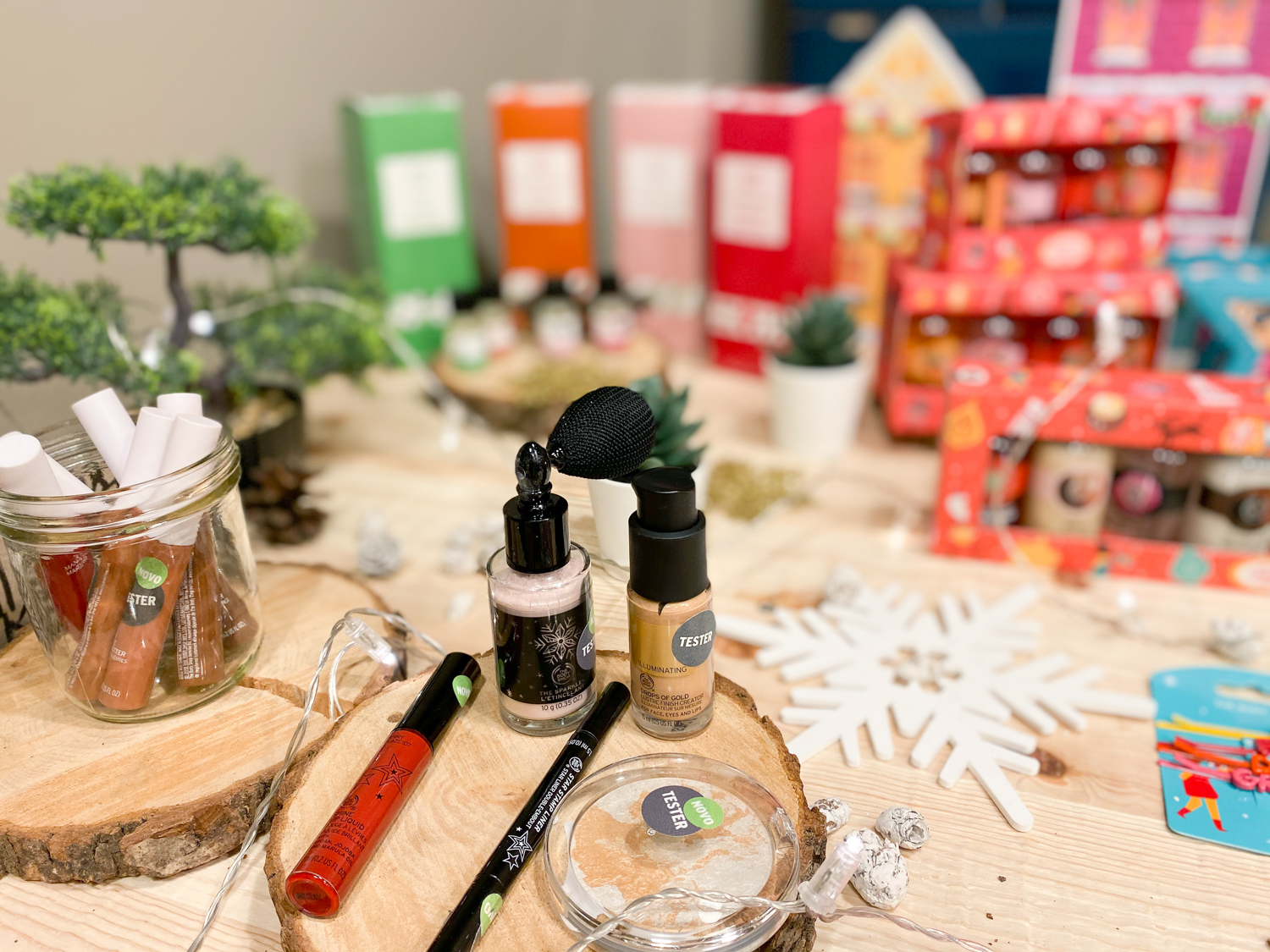 Za letošnje praznike so pripravili tudi kup srčkanih paketkov za darila in nekaj adventnih koledarjev. Sploh mi je všeč trak za lase, ki se ga uporablja pri odstranjevanju ličil – našle ga boste na prvi sliki, gre za jelenčka! Skratka, zasula vas bom s fotografijami z dogodka in posnetki z domačega photoshootinga izdelkov, tako da se pripravite na čudovito dišeče popotovanje <3